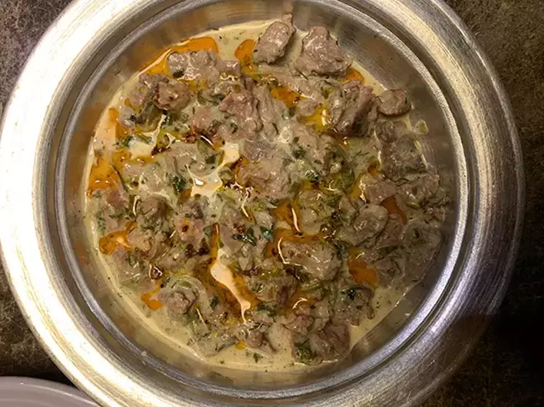 Et yıkanıp süzülür. Tencere ocağa alınır, ısındıktan sonra et ilave edilir ve kavrulur. Rengi dönünce irice doğranmış taze soğanlar üzerine ilave edilir. 2-3 su bardağı kaynar su ilave edilir. Nane ile dereotu kıyılıp ilave edilir. Tuzu biberi eklenir. Et yumuşayıncaya kadar haşlamaya devam edilir. Yoğurt, yumurta, limon ve un bir kapta karıştırılır ve güzelce çırpılır. Tencere ocaktan alınmadan önce ılıştırılarak terbiye yemeğe ilave edilir. Hafifçe karıştırılarak kıvam alması beklenir. Kıvam aldığında ocağın altı kapatılır. Servis ederken dileyen pul biberli kızdırılmış yağ ilave edebilir.
